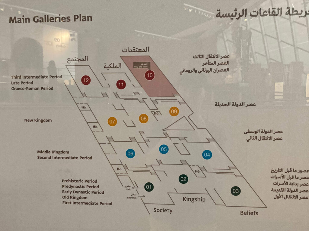 大エジプト博物館は、4つのフロア(古王国時代、中王国時代、新王国時代、ギリシャ‐ローマ時代)と各フロアに設けられた 3つのセクション (社会・王権・信仰)によって構成されており、フロアによって時代が分かれている仕組みになっています。とにかく館内は広大で、すべてをじっくり見ようとすると1日では足りないほどです。