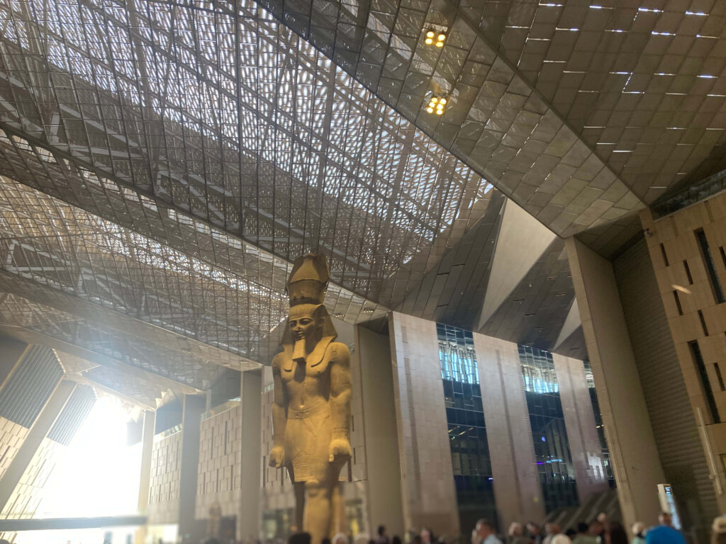 これまでカイロ中心部にあった旧エジプト考古学博物館とはまったく別物で、展示の見せ方、保存状態、動線、建築デザイン、すべてが新しくアップデートされていました。特に、入口で迎えてくれる 巨大なラムセス2世像 の迫力は、写真で見るのとは比べものになりません。