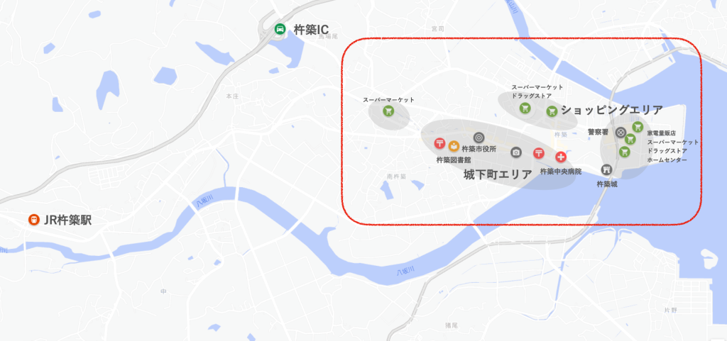 杵築市はコンパクトな街で、主に 城下町エリア(観光や行政の中心)と ショッピングエリア(大型スーパーやホームセンターが集まるエリア)に集約されており、この2つを押さえておけば、快適な生活が送れます。