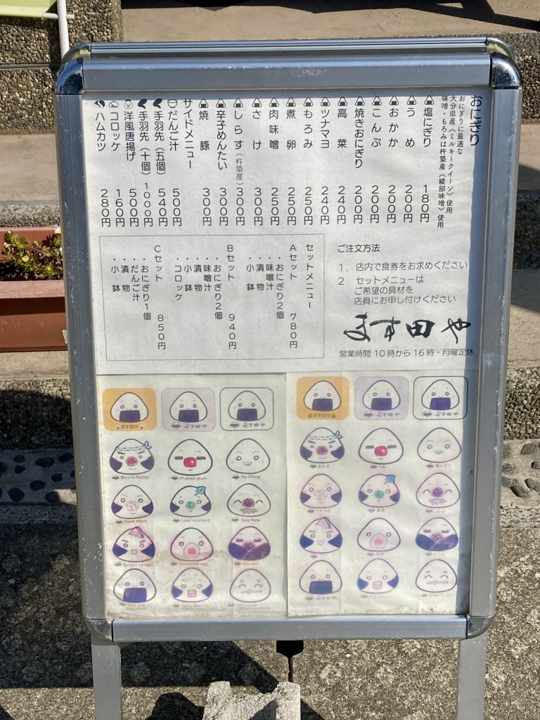 「ます田や」は、杵築市の観光スポット「酢屋の坂」のすぐ近くに位置するおにぎり専門店です。江戸時代の面影を色濃く残す城下町で、地元食材を使ったこだわりのおにぎりが楽しめます。
