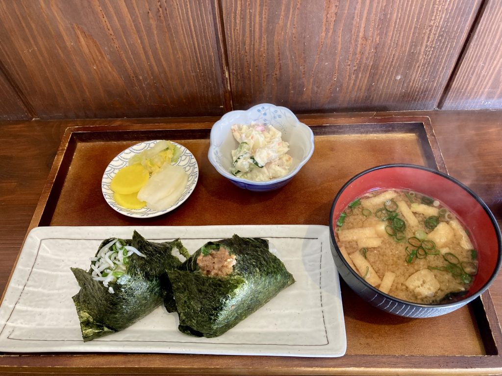 おにぎりに味噌汁、漬物、ポテトサラダがついたシンプルながら満足度の高いセットで、風情ある城下町の景色を眺めながらいただくと、美味しさがさらに引き立ちます。