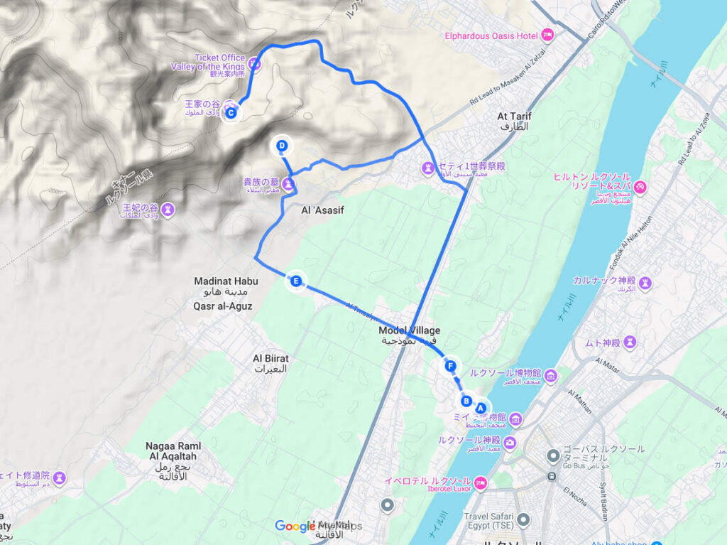 A.公共フェリー → B.自転車レンタル → C.王家の谷 → D.ハトシェプスト葬祭殿 → E.(メムノンの巨像)→F.帰還