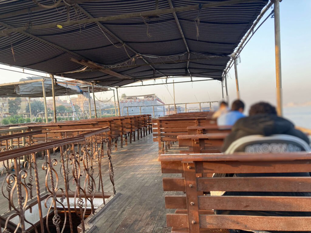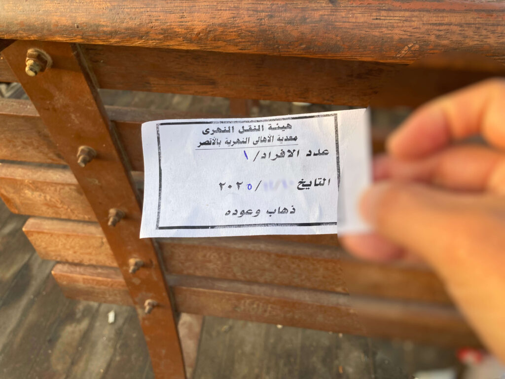 行きの段階で 往復チケット(50EGP) を購入していたため、帰りはそのまま同じチケットで乗船できました。チケットにはアラビア語が書かれており、「本当にこれで帰れるのか?」と少し不安でしたが、特に問題なくスムーズに乗船できました。