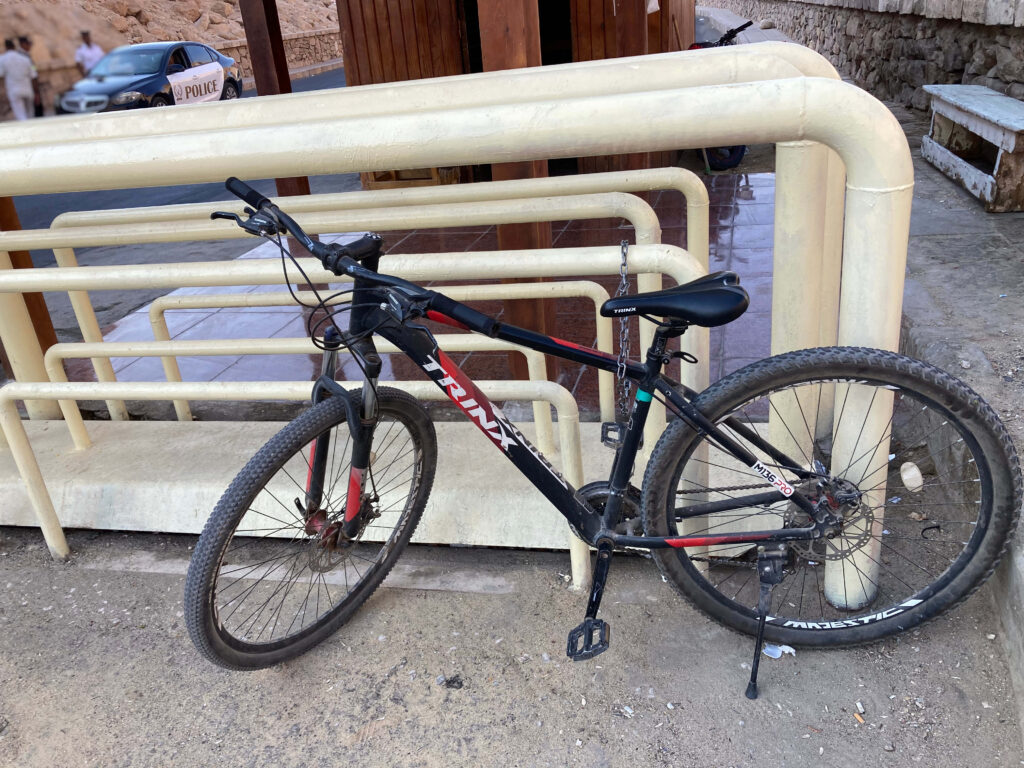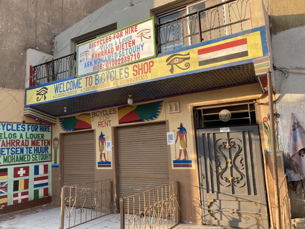 エジプトの日中は気温が非常に高く、特にルクソールは暑さが厳しいため、この日は早朝6:00に行動開始。自転車は西岸にあるローカルのレンタルショップで借りることにしました。ホテルでもレンタルできましたが、1日$10US(約1,600円)と少し割高だったため、ローカルな店の方が料金が抑えられると感じたためです。