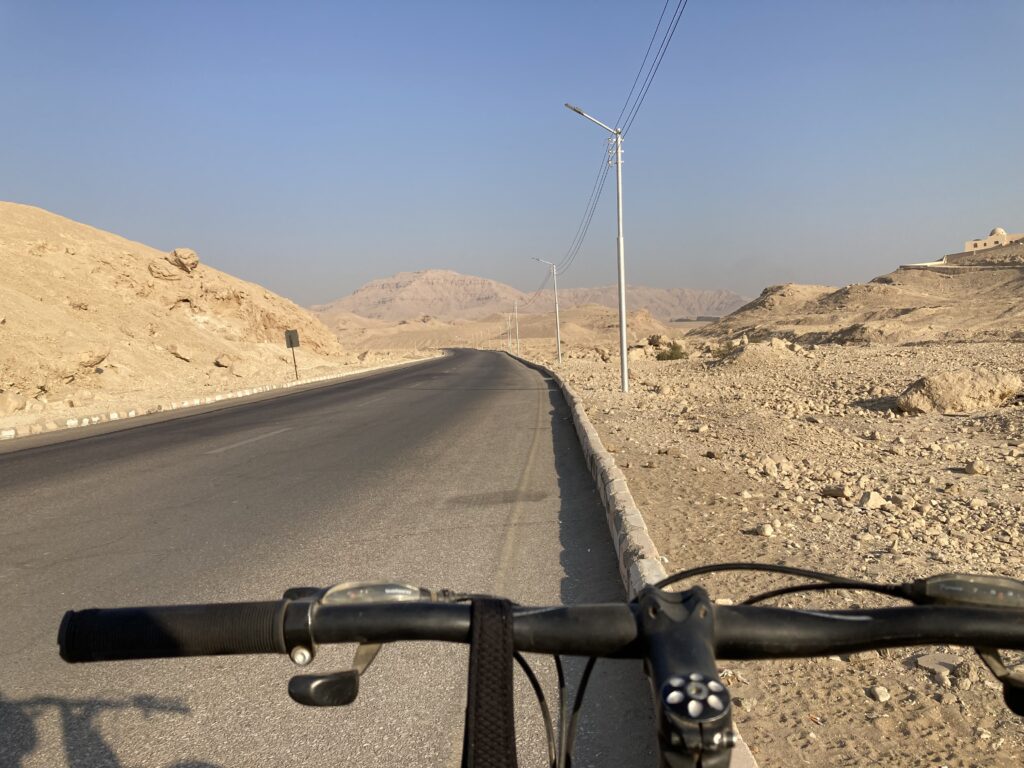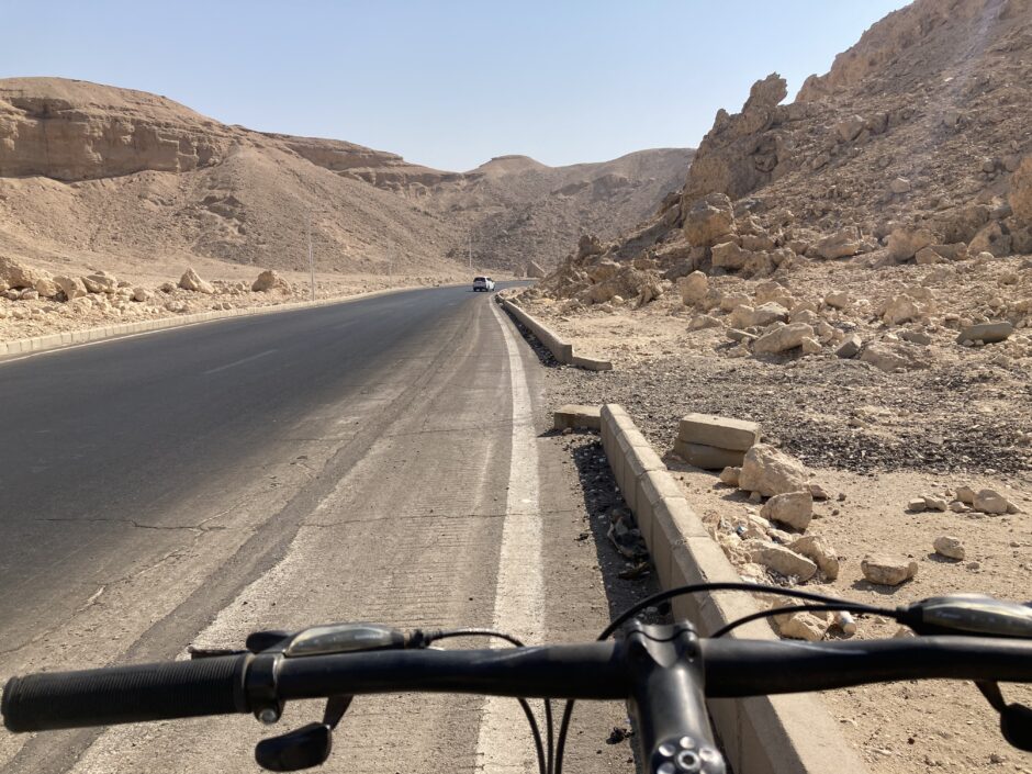 王家の谷を見終えて自転車で下り坂に入ると、エジプトの雄大な岩山と砂漠が一気に広がり、最高に気持ちいい絶景タイムが始まります。この区間はサイクリングのハイライトと言ってもいいほど爽快です。