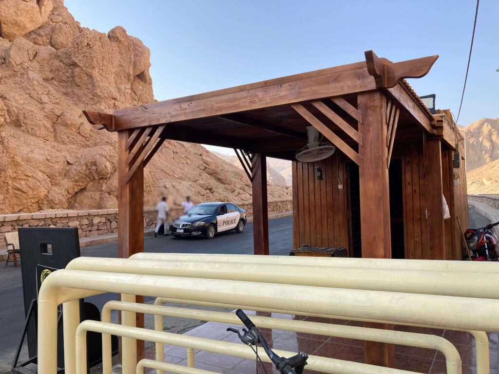 ハトシェプスト葬祭殿に到着すると、また声をかけられました。今度は自ら警察を名乗る男が現れ、「自転車は俺が見ておいてやるから、ここに止めろ」と、警察の待機エリアのような場所に駐輪するよう指示されました。鍵もかけずに置いてきてしまったため、本当に信用していいのか少し不安になりました。