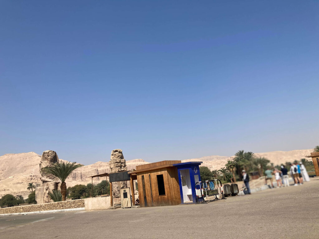 ハトシェプスト葬祭殿の観光を終えたら、メムノンの巨像(Colossi of Memnon) に立ち寄るのがおすすめです。周囲にはカフェや売店もあるので、休憩にも最適です。